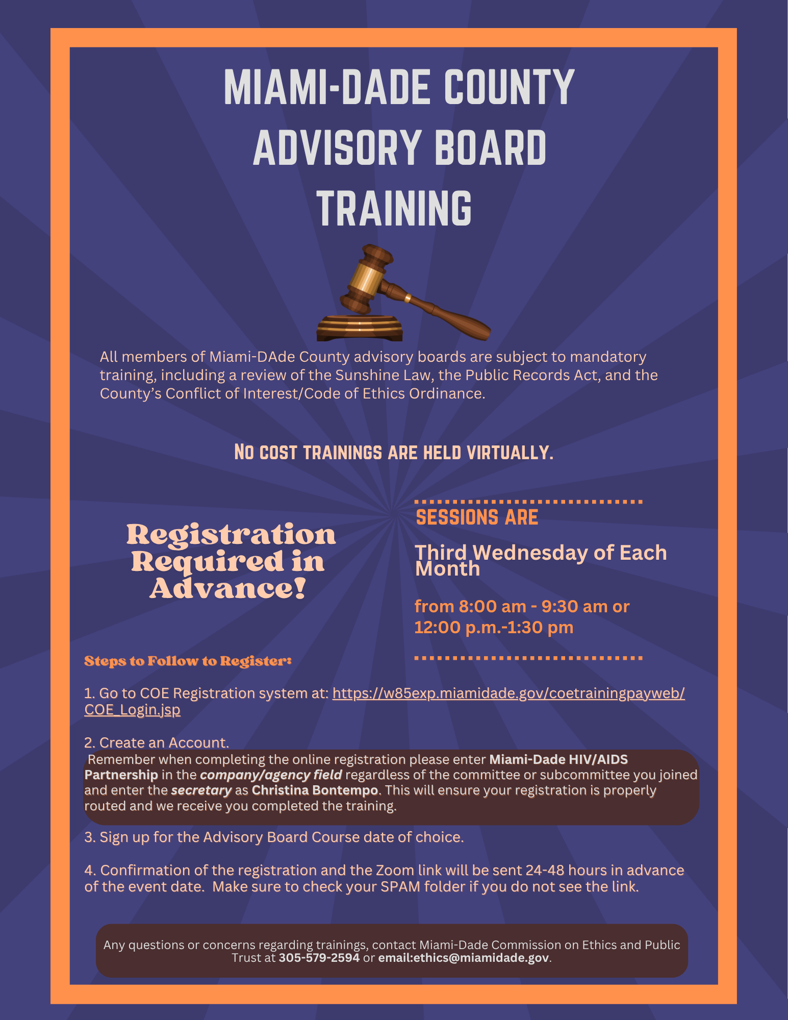 - Serve in an advisory capacity to the Board of County Commissioners, City of Miami, Miami-Dade County Health Department Office of HIV/AIDS, the respective mayors, the U. S. Health Resources and Services Administration (HRSA) and other public and governmental entities with respect to all issues affecting or relating to persons at risk of contracting or living with HIV/AIDS.